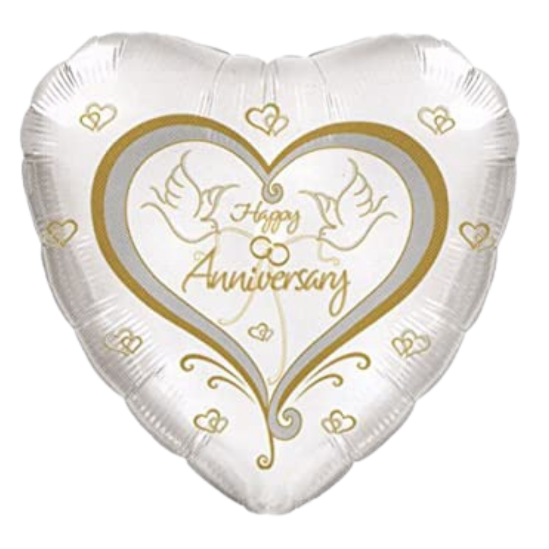 18”Heart-shaped  Helium Mylar Balloon in silver, white and gold with hearts, birds and gold rings.