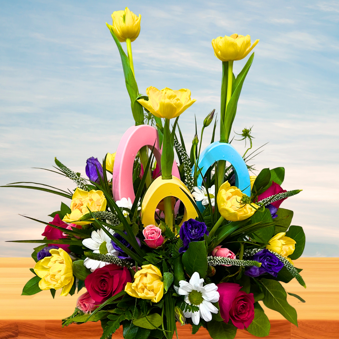 Three sweet keepsake egg bud vases are tucked into a cheerful spring floral design. Delivery or pickup in Naples, Florida.