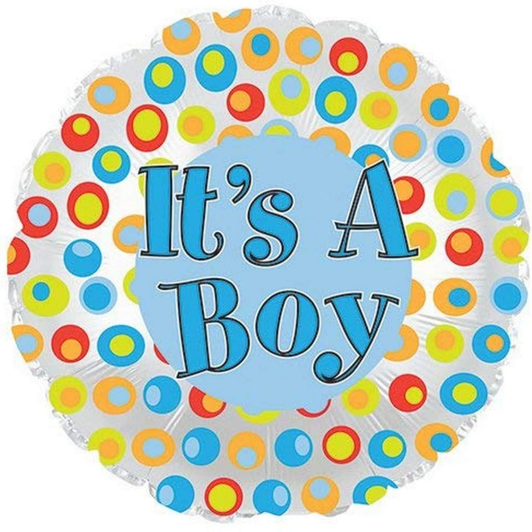 18” Helium Mylar Balloon dot patterns with orange, blue, green, yellow and  It’s A Boy script in blue.