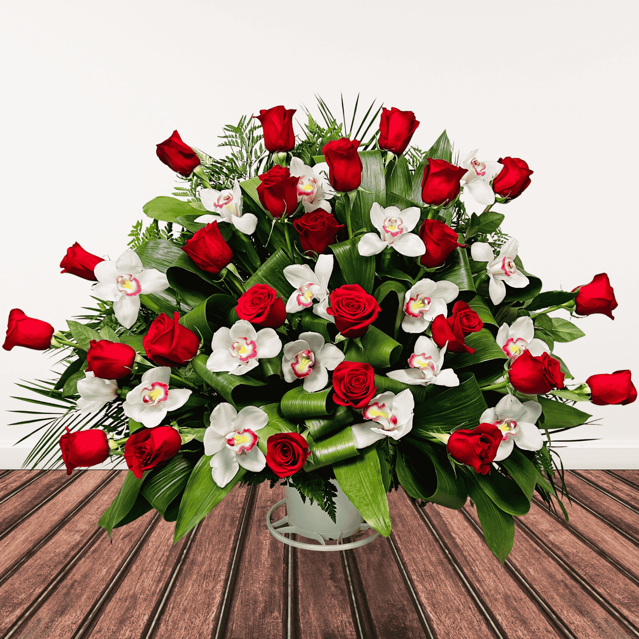A graceful sympathy arrangement of red roses and white cymbidium orchids, symbolizing eternal love, purity, and remembrance.