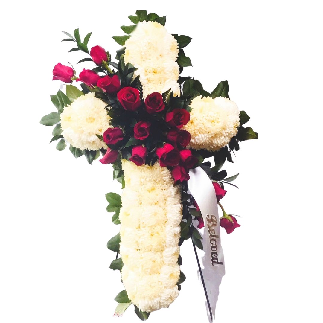 White mums or carnations create a pillowed shaped cross that is designed with eighteen red Roses at the heart of this aetherial cross.